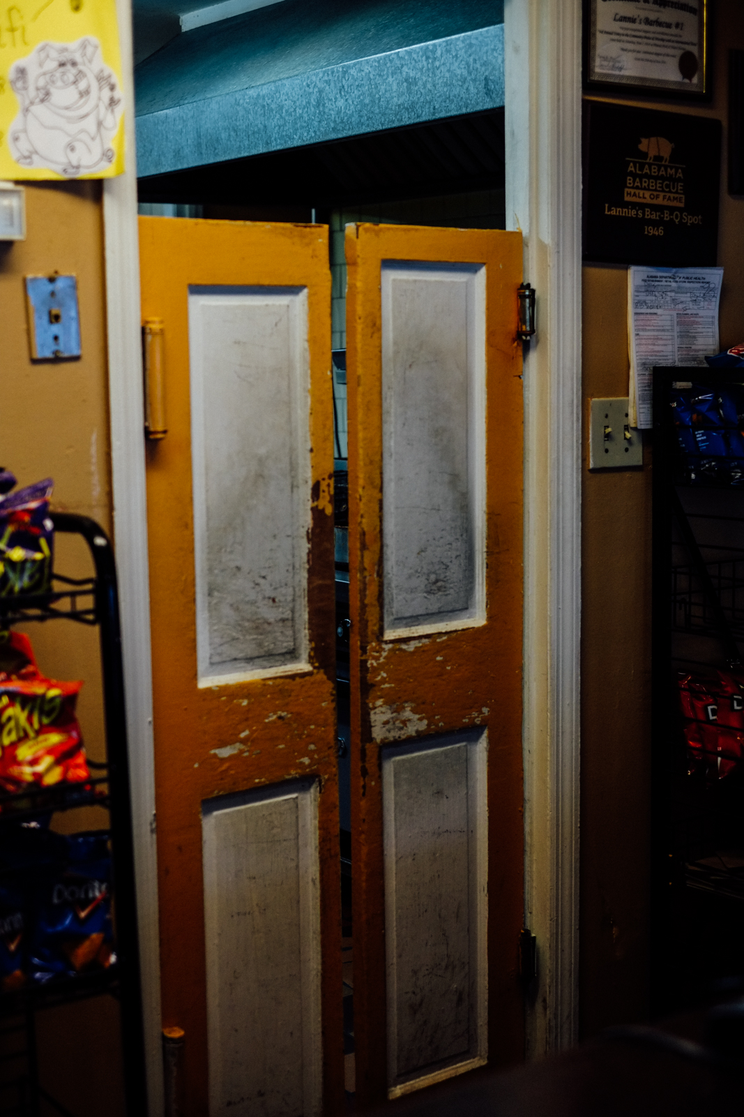 DSCF8175 ← Previous Next → Doors to the kitchen of Larnie’s BBQ, which has been in business for 70+ years in Selma.